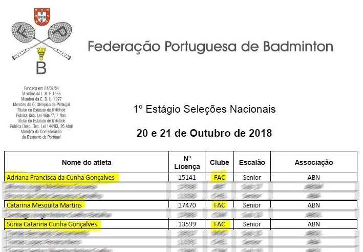 As atletas Adriana Gonçalves, Catarina Martins e Sónia Gonçalves foram convocadas pela Federação Portuguesa de Badminton para o 1º Estágio de Seleções Nacionais, no escalão Senior.
